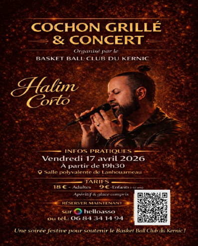Retour liste Home >Animations >Abend mit gegrilltem Schwein und Konzert Abend mit gegrilltem Schwein und Konzert Lanhouarneau Ab 18€ Öffnungszeiten – Am Friday 17 April 2026 à 19:30 Preise Grundpreis : ab 18,00€ Kindertarif : ab 9,00€ (- de 12 ans) Lage Salle polyvalente Lanhouarneau Tel. 06 84 34 14 94 Zu meinen FavoritenEntfernen aus den Favoriten Route & Zugang In der Nähe