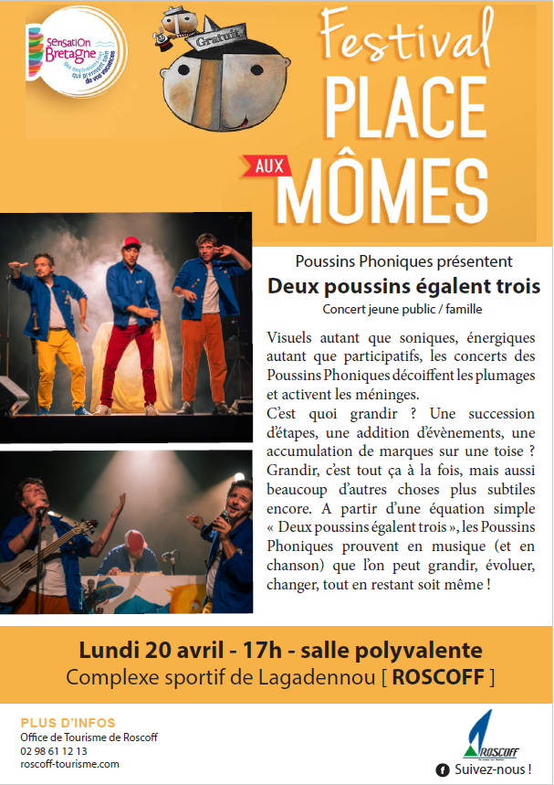 Retour liste Home >Animations >Festival Place aux Mômes- 2 Küken gleich 3. Festival Place aux Mômes- 2 Küken gleich 3. Roscoff Öffnungszeiten – Am Monday 20 April 2026 à 17:00 Lage Complexe sportif Lagadennou Roscoff Tel. 02 98 24 43 00 Zu meinen FavoritenEntfernen aus den Favoriten Route & Zugang In der Nähe