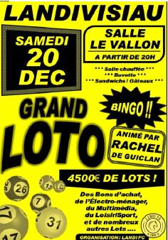 Retour liste Home >Animations >Loto Bingo Loto Bingo Landivisiau Öffnungszeiten – Am Saturday 20 December 2025 à 20:00 Lage Salle Le Vallon Landivisiau Webseite Zu meinen FavoritenEntfernen aus den Favoriten Route & Zugang In der Nähe