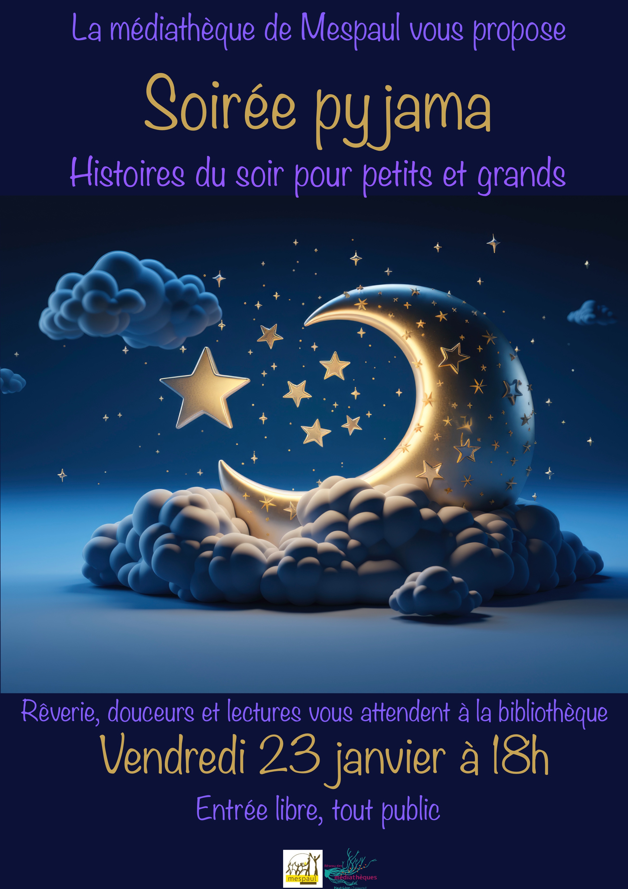 Retour liste Home >Animations >Pyjama-Abend in der Mediathek Pyjama-Abend in der Mediathek Mespaul Öffnungszeiten – Am Friday 23 January 2026 de 18:00 à 19:00 Lage Médiathèque 55 rue de la Mairie Mespaul Tel. 02 98 61 59 79 Webseite Zu meinen FavoritenEntfernen aus den Favoriten Route & Zugang In der Nähe