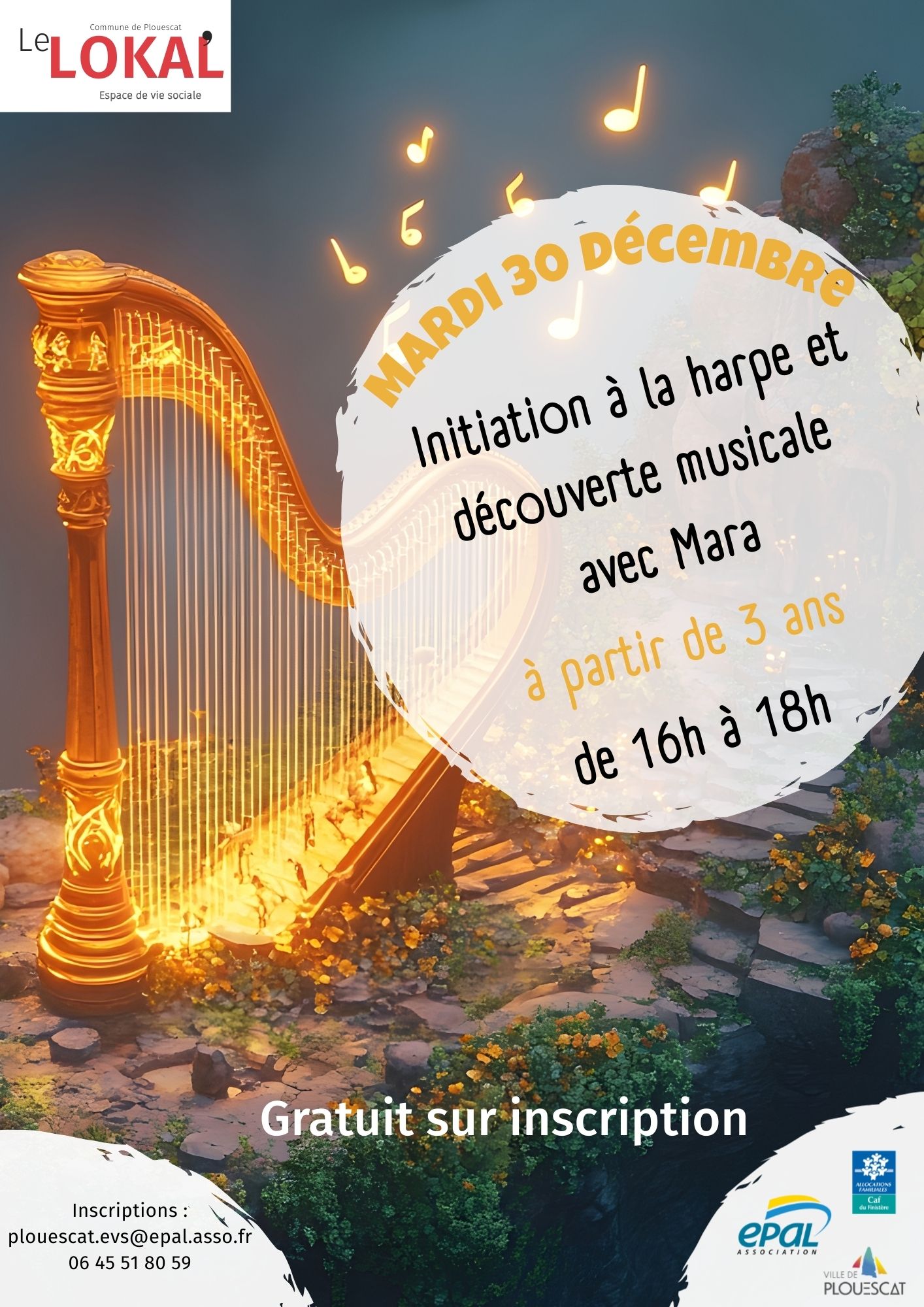 Retour liste Home >Animations >Initiation à la harpe et découverte musicale Initiation à la harpe et découverte musicale Plouescat Opening – The Tuesday 30 December 2025 de 16:00 à 18:00 Location Le Lokal 5 parc des Sports Plouescat Tel. 06 45 51 80 59 plouescat.evs@epal.asso.fr Website Add to favoritesRemove from favorites Route & access Nearby