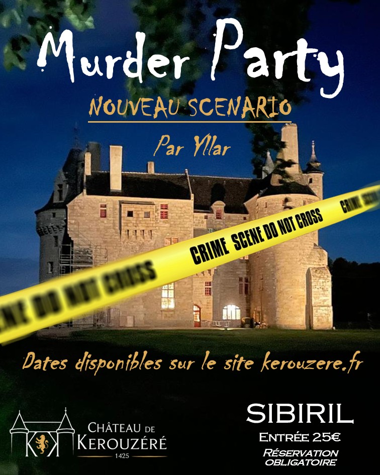 Retour liste Home >Animations >Murder Party au Château de Kerouzéré Murder Party au Château de Kerouzéré Sibiril From 25€ Opening – The Saturday 18 April 2026 de 18:00 à 21:00 – The Friday 24 April 2026 de 18:00 à 21:00 – The Thursday 30 April 2026 de 18:00 à 21:00 Prices Base rate : from 25,00€ Child rate : from 18,00€ (12-18 ans.) Location Château de Kerouzéré Sibiril Tel. 06 73 71 85 92 chateau.kerouzere@gmail.com Add to favoritesRemove from favorites Route & access Nearby