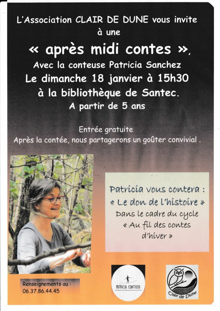 Retour liste Home >Animations >Storytelling afternoons – Clair de Dune Storytelling afternoons – Clair de Dune Santec Opening – The Sunday 18 January 2026 à 15:30 Location Médiathèque 71 Place Isidore Roudaut Santec Tel. 06 37 86 44 45 Add to favoritesRemove from favorites Route & access Nearby