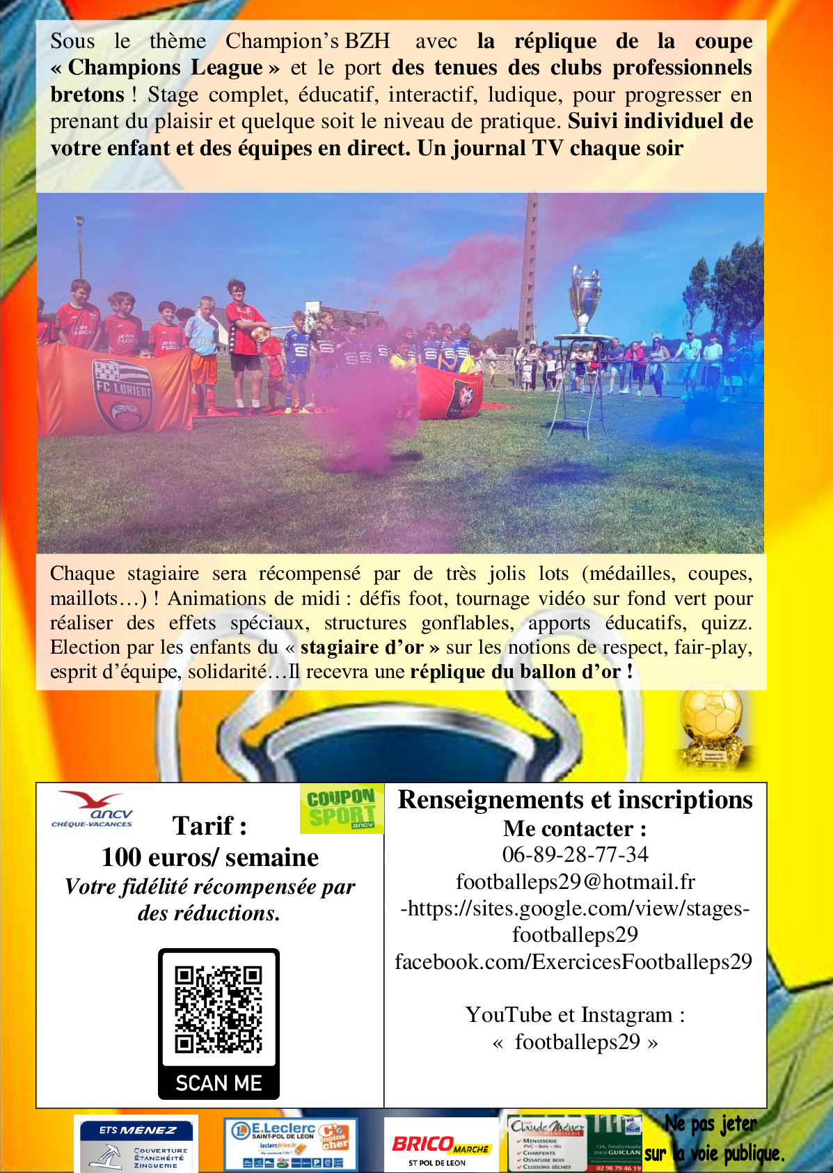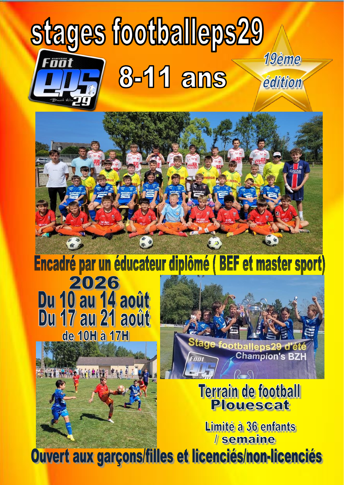 Retour liste Home >Animations >Summer football course 8-11 years Summer football course 8-11 years Plouescat 90€ Opening – From Monday 10 August 2026 to Friday 14 August 2026 de 10:00 à 17:00 – From Monday 17 August 2026 to Friday 21 August 2026 de 10:00 à 17:00 Prices Base rate : from 90,00€ to 100,00€ Location terrain de football prat ar goasven Plouescat Tel. 06 89 28 77 34 footballeps29@hotmail.fr Website Add to favoritesRemove from favorites Route & access Nearby