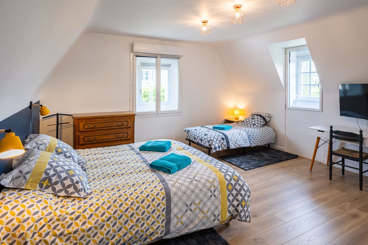 Au 1er étage de notre maison rénovée située à 5 mn en voiture des plages de sable fin et à 2km du GR34, nous mettons à votre disposition 3 chambres avec 1 lit en 160cm ainsi qu’une salle de bain et WC privatifs pour chacune.