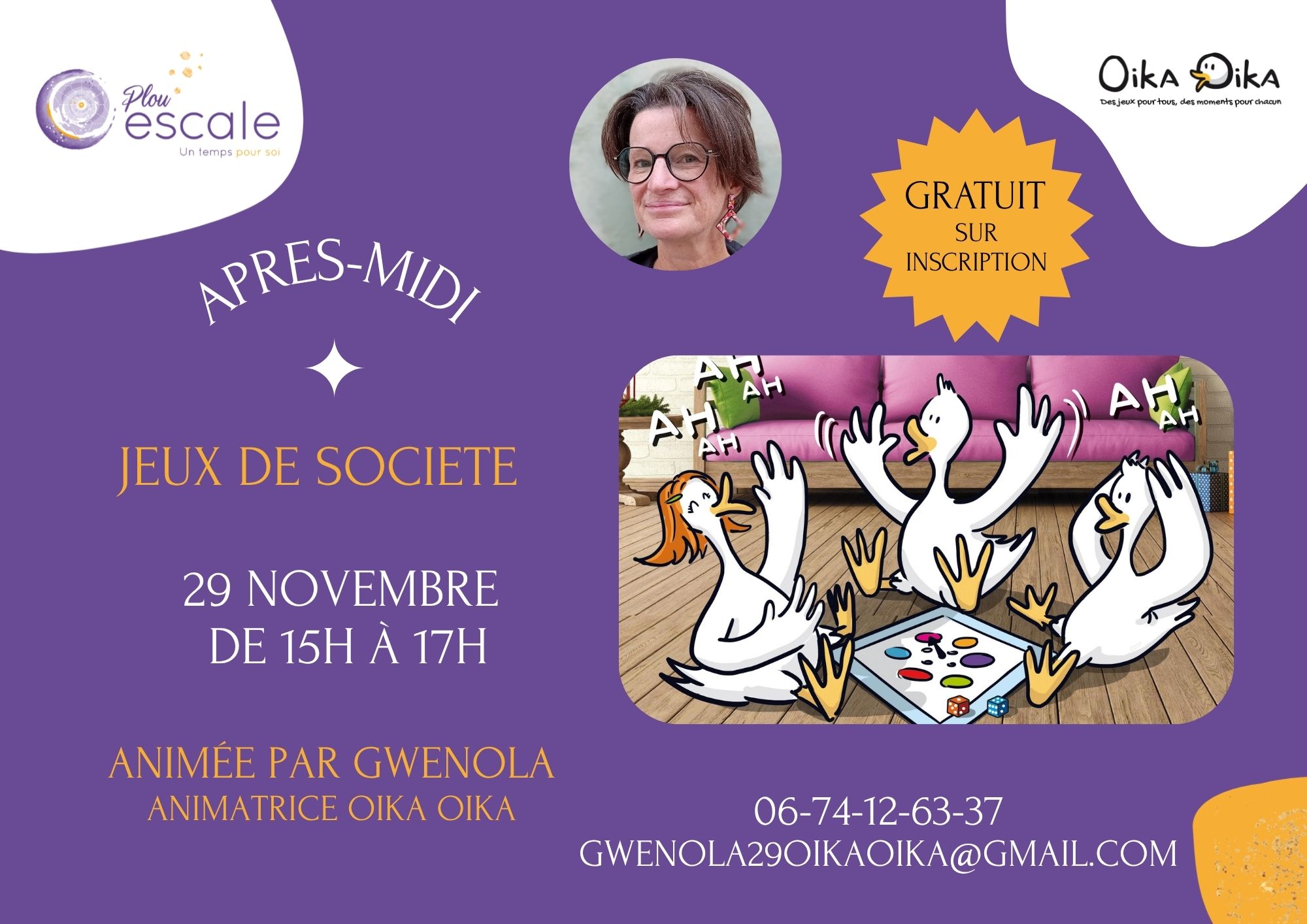 Retour liste Accueil >Animations >Après-midi Jeux de société Après-midi Jeux de société Plouescat Venez jouer et tester des jeux de société, de tous styles, pour tout âge, dans une ambiance joyeuse et détendue !Ouvert à tousAtelier gratuit proposé par Gwenola, animatrice Oika OikaSur inscription Dates et heures de l’événement – Le samedi 29 novembre 2025 de 15:00 à 17:00 Localisation Plou’escale 16 Rue de Strasbourg Plouescat Tel. 06 74 12 63 37 gwenola29oikaoika@gmail.com Ajouter au carnetRetirer du carnet Itinéraire – Accès À proximité