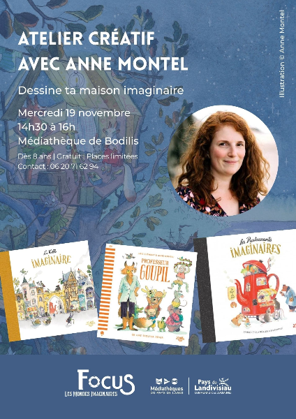 Dans le cadre de FOCUS – Les Mondes Imaginaires, la médiathèque de Bodilis accueille Anne Montel le temps d’un atelier créatif. Découvre l’univers de l’artiste, ses livres, et partage un moment convivial autour du dessin. Dès 8 ans, gratuit, places limitée.