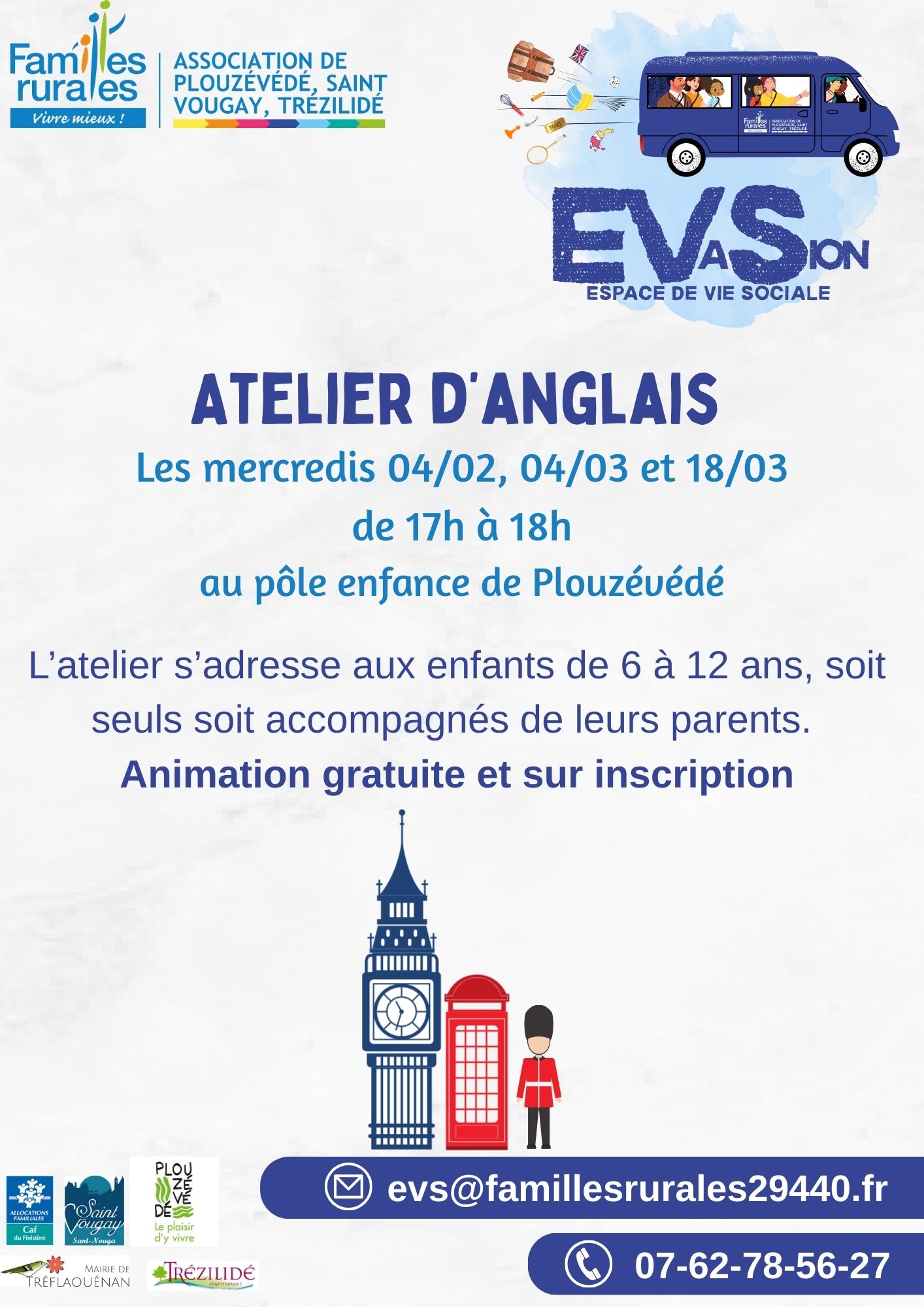 Retour liste Accueil >Animations >Atelier d’anglais Atelier d’anglais Plouzévédé Atelier pour les enfants de 6 à 12 ans, seuls ou accompagnés de leurs parents. Séances animées par Anne-Laure Le Duff. Gratuit sur inscription. Dates et heures de l’événement – Le mercredi 4 février 2026 de 17:00 à 18:00 – Le mercredi 4 mars 2026 de 17:00 à 18:00 – Le mercredi 18 mars 2026 de 17:00 à 18:00 Localisation Pôle enfance Plouzévédé Tel. 07 62 78 56 27 evs@famillesrurales29440.fr Ajouter au carnetRetirer du carnet Itinéraire – Accès À proximité
