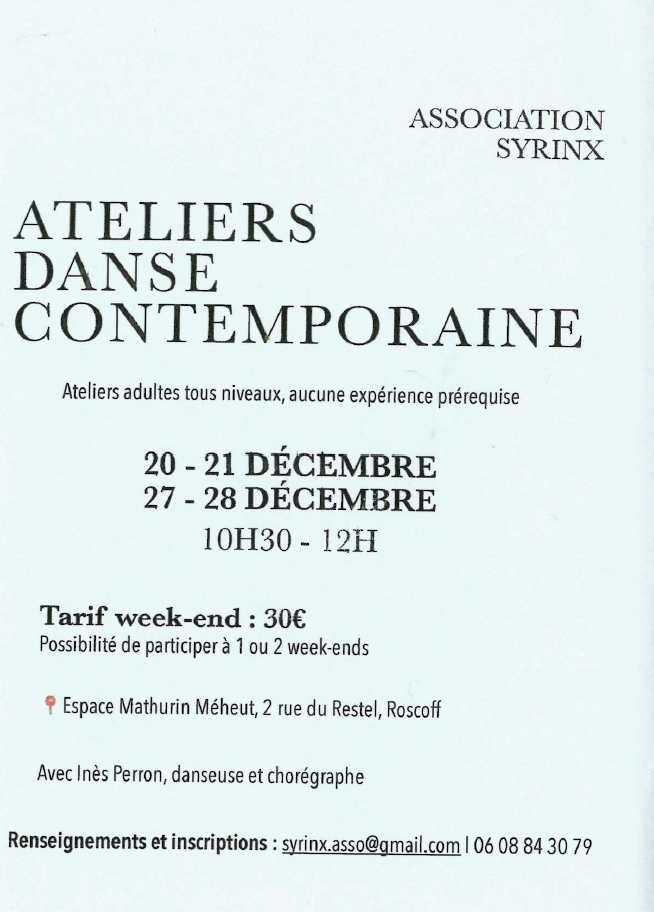 L’association Syrinx propose des ateliers pour adultes tous niveaux, aucune expérience prérequise. Possibilité de participer à 1 ou 2 week-ends. Avec Inès Perron, danseuse de choréographe.