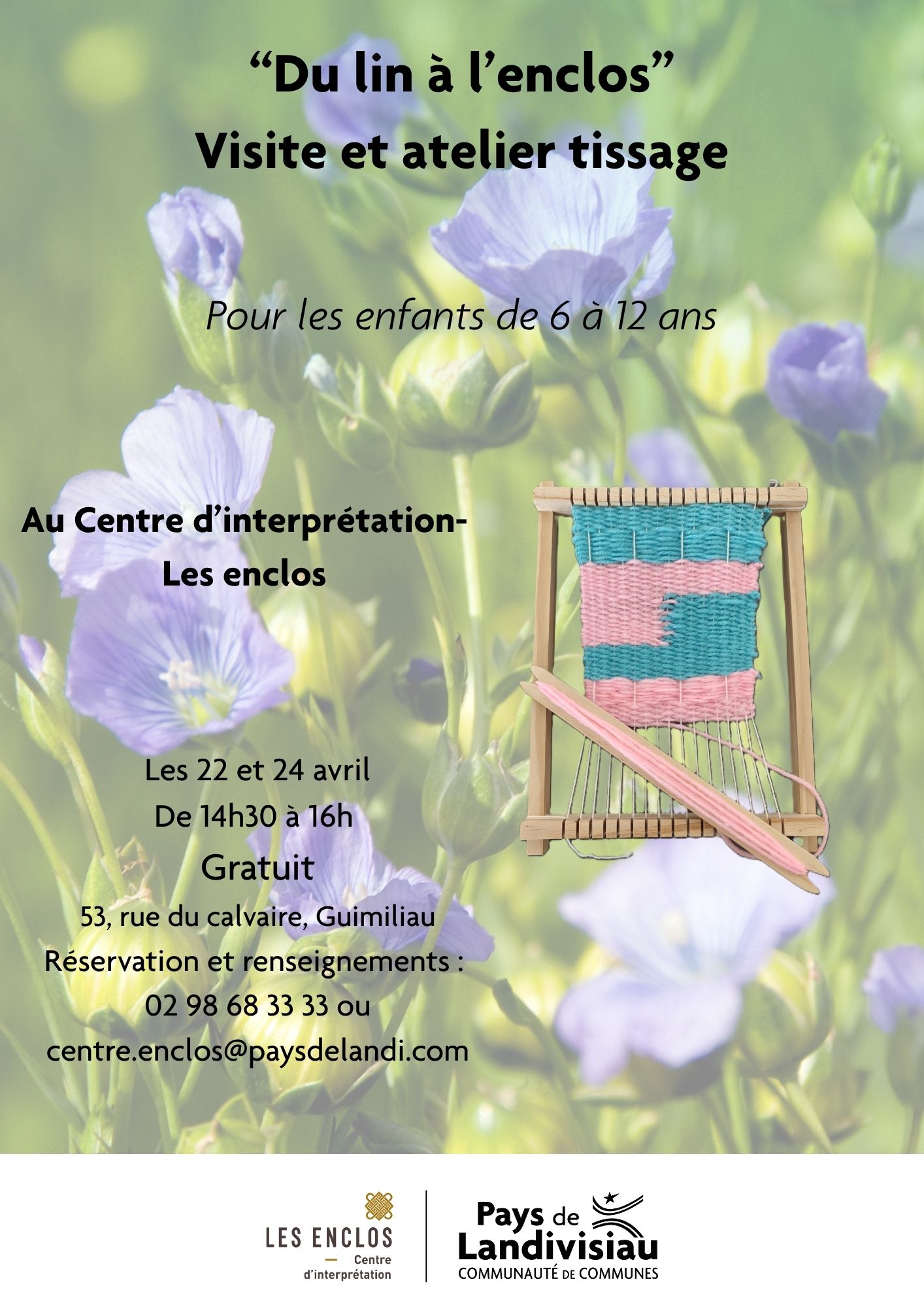 Retour liste Accueil >Animations >Atelier enfants « Du lin à l’enclos » Atelier enfants « Du lin à l’enclos » Guimiliau Atelier tissage. Après une visite dans l’enclos sur les traces du lin et des tissus précieux, les participants pourront à leur tour créer une pièce tissée. Pour les enfants de 6 à 12 ans. Gratuit sur inscription. Au Centre d’interprétation-Les enclos. Dates et heures de l’événement – Le mercredi 22 avril 2026 de 14:30 à 16:00 – Le vendredi 24 avril 2026 de 14:30 à 16:00 Localisation CIAP Les Enclos 53 rue du Calvaire Guimiliau Tel. 02 98 68 33 33 centre.enclos@paysdelandi.com Ajouter au carnetRetirer du carnet Itinéraire – Accès À proximité