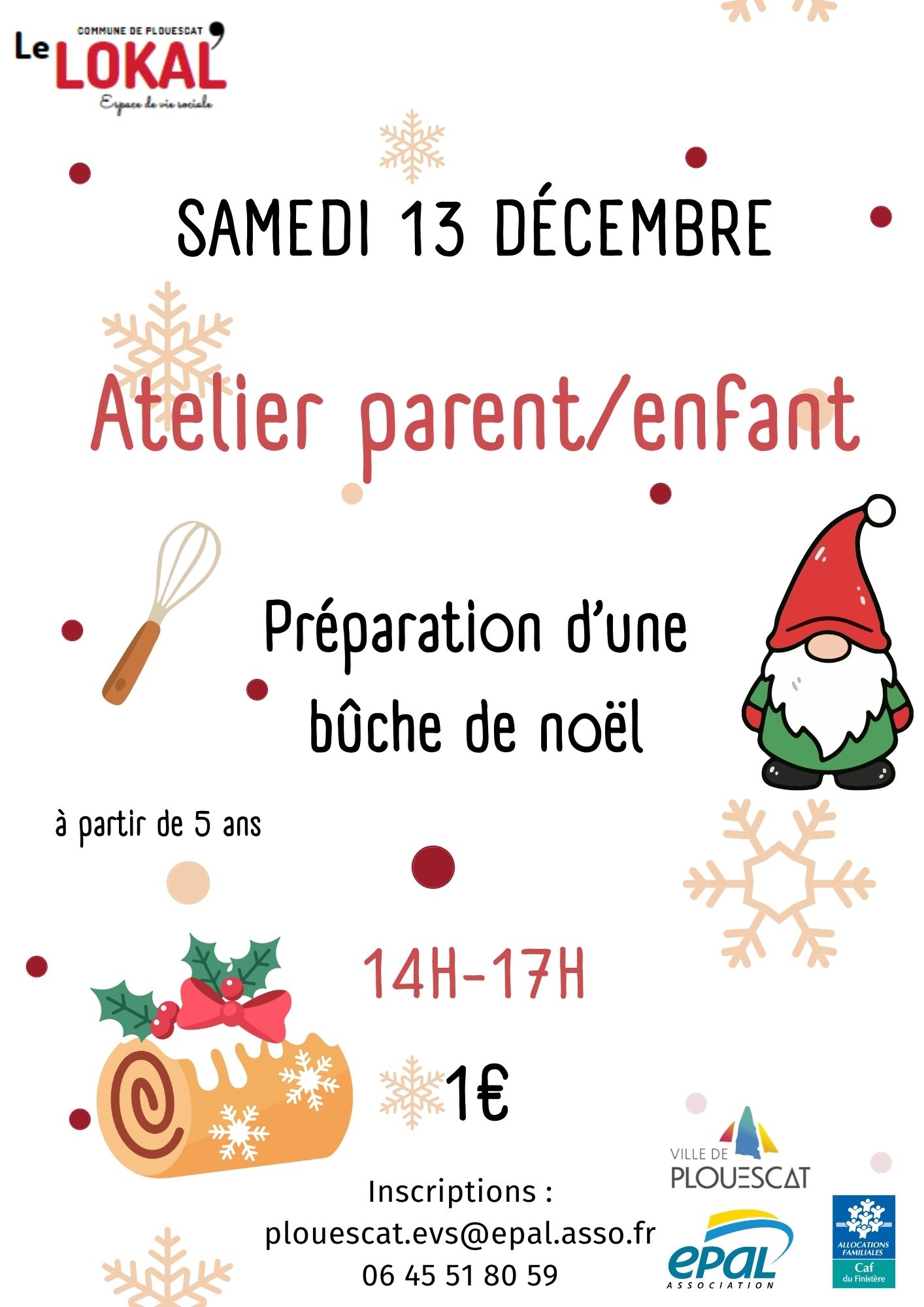 Retour liste Accueil >Animations >Atelier parents/enfants bûche de Noël Atelier parents/enfants bûche de Noël Plouescat 1€ À partir de 5 ans. Payant, sur inscription. Dates et heures de l’événement – Le samedi 13 décembre 2025 de 14:00 à 17:00 Tarifs Tarif de base : à partir de 1,00€ Localisation Le Lokal 5 parc des Sports Plouescat Tel. 06 45 51 80 59 plouescat.evs@epal.asso.fr Site internet Ajouter au carnetRetirer du carnet Itinéraire – Accès À proximité