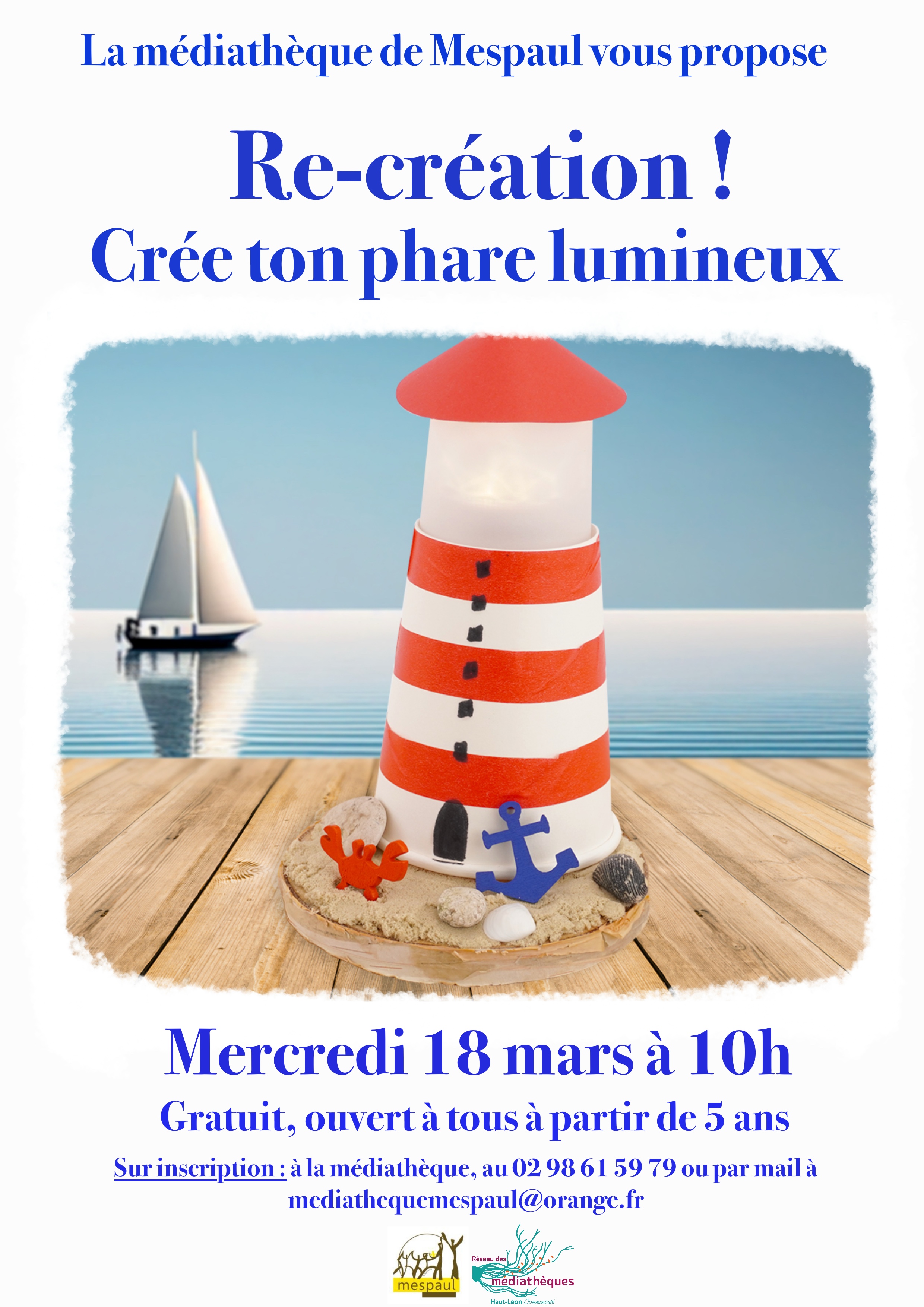 Retour liste Accueil >Animations >Atelier Re-création Atelier Re-création Mespaul Venez créer un petit phare lumineux à partir d’objets de récup’ (gobelet, coquillages, papiers, … ). Pour les enfants à partir de 5 ans. Dates et heures de l’événement – Le mercredi 18 mars 2026 à 16:00 Localisation Médiathèque 55 rue de la Mairie Mespaul Tel. 02 98 61 59 79 bibliothequemespaul@gmail.com Site internet Ajouter au carnetRetirer du carnet Itinéraire – Accès À proximité