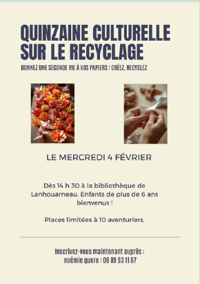 Retour liste Accueil >Animations >Atelier Récup’ papier Atelier Récup’ papier Lanhouarneau Donnez une seconde vie à vos papiers : créez, recyclez. Enfants de plus de 6 ans bienvenus. Places limitées à 10. Inscriptions auprès de Noémie Quéré. Dates et heures de l’événement – Le mercredi 4 février 2026 à 14:30 Localisation Médiathèque Rue du Stade Lanhouarneau Tel. 06 89 93 11 87 Ajouter au carnetRetirer du carnet Itinéraire – Accès À proximité