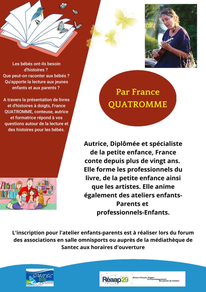 Atelier parents-enfants spécial tout-petits en compagnie de France Quatromme qui répondra et vous conseillera sur les lectures, contes, histoires à doigts, etc adaptés aux tout-petits. Un livre offert pour le 9-35 mois.