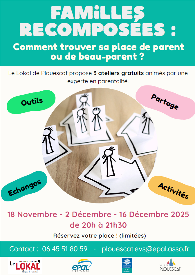 Retour liste Accueil >Animations >Ateliers sur la parentalité : Familles recomposées Ateliers sur la parentalité : Familles recomposées Plouescat Familles recomposées : Comment trouver sa place de parent ou de beau-parent ? Le Lokal de Plouescat propose 3 ateliers gratuits animés par une experte en parentalité. Outils, partage, échanges et activités sont au programme. Réservez votre place ! (limitées) Dates et heures de l’événement – Le mardi 18 novembre 2025 de 20:00 à 21:30 – Le mardi 2 décembre 2025 de 20:00 à 21:30 – Le mardi 16 décembre 2025 de 20:00 à 21:30 Localisation Le Lokal 5 parc des Sports Plouescat Tel. 06 45 51 80 59 plouescat.evs@epal.asso.fr Site internet Ajouter au carnetRetirer du carnet Itinéraire – Accès À proximité