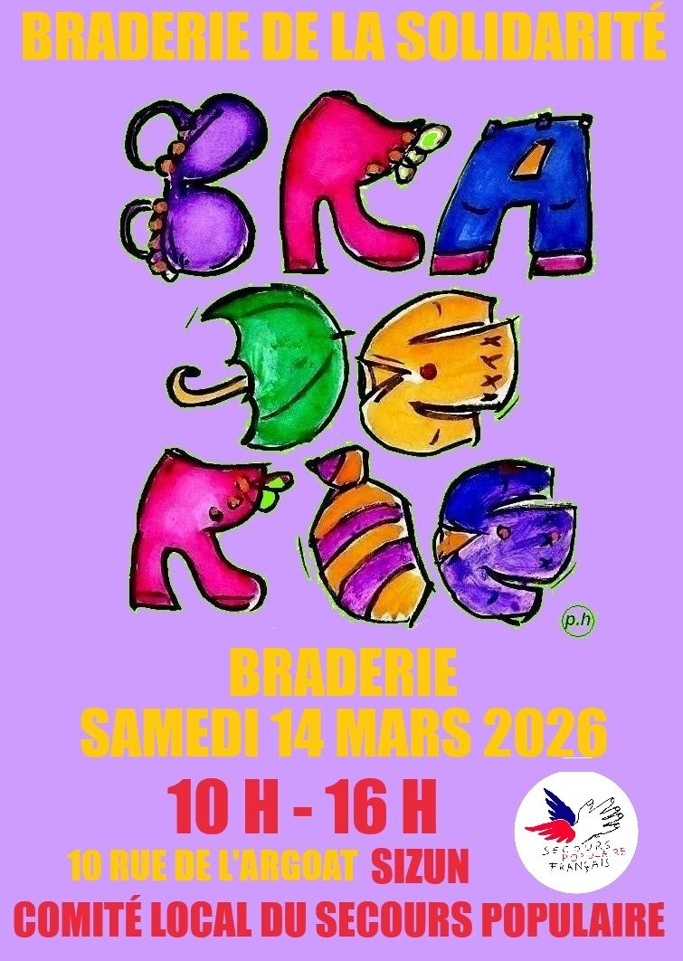 Retour liste Accueil >Animations >Braderie de la solidarité Braderie de la solidarité Sizun Vêtements, vaisselle, livres, jouets … De 10h à 12h : concert du groupe « le Blaireau Acoustique » de l’Hopital Camfrout. Dates et heures de l’événement – Le samedi 14 mars 2026 de 10:00 à 16:00 Localisation 10 rue de l’Argoat Sizun Tel. 06 62 54 12 73 gouezrose@yahoo.fr Ajouter au carnetRetirer du carnet Itinéraire – Accès À proximité