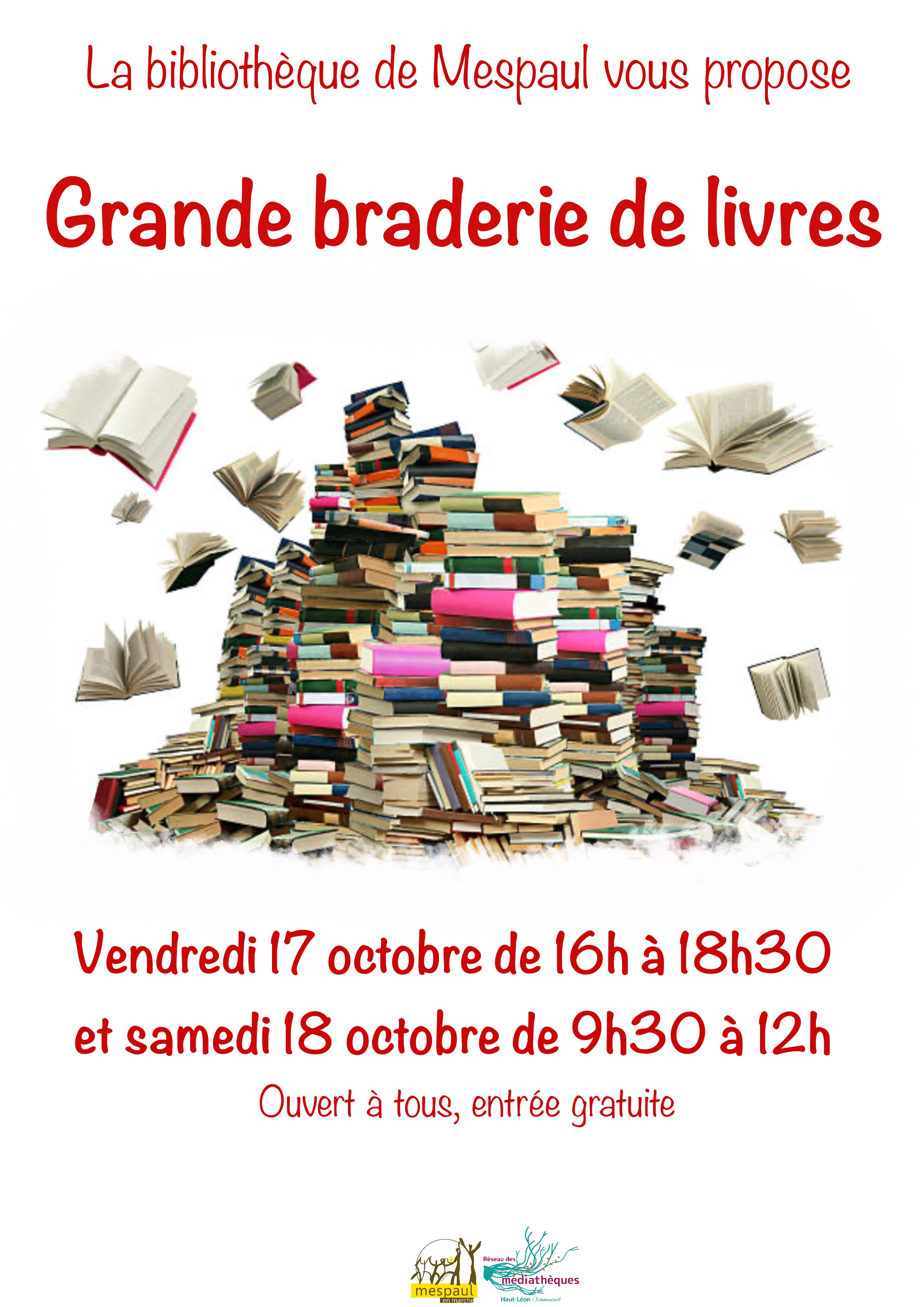 Retour liste Accueil >Animations >Braderie livres Braderie livres Mespaul Romans, BD, adultes et jeunesse … Venez profiter de documents à petits prix ! Dates et heures de l’événement – Le vendredi 17 octobre 2025 de 16:00 à 18:30 – Le samedi 18 octobre 2025 de 09:30 à 12:00 Localisation Médiathèque 55 rue de la Mairie Mespaul Tel. 02 98 61 59 79 Site internet Ajouter au carnetRetirer du carnet Itinéraire – Accès À proximité