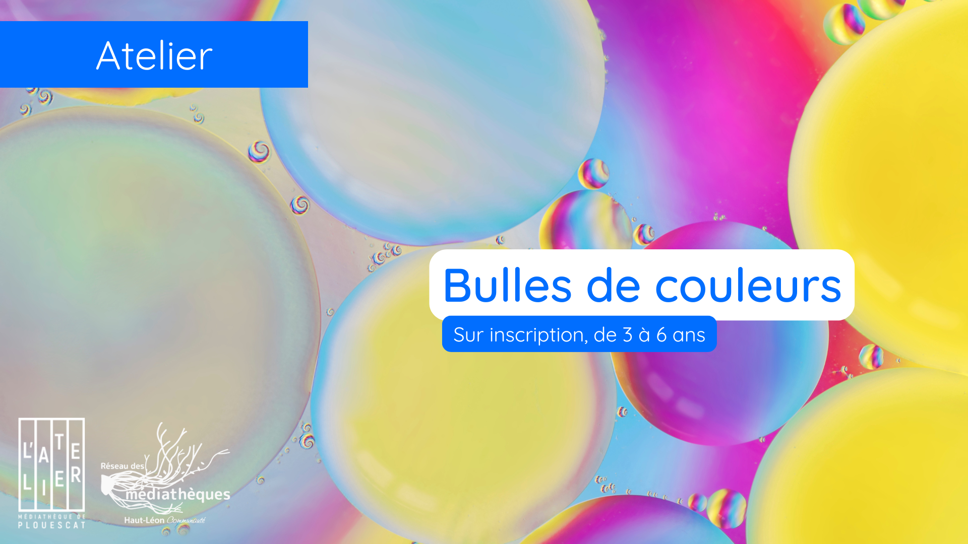 Retour liste Accueil >Animations >Bulles de couleur Bulles de couleur Plouescat À la manière de Marcelle Loubchansky, viens créer une explosion de couleurs.Sur inscription, de 3 à 6 ans. Dates et heures de l’événement – Le mercredi 22 octobre 2025 à 15:00 Localisation Médiathèque l’Atelier 14, place du dauphin Plouescat Tel. 02 98 69 88 81 latelier.mediatheque@plouescat.fr Site internet Ajouter au carnetRetirer du carnet Itinéraire – Accès À proximité