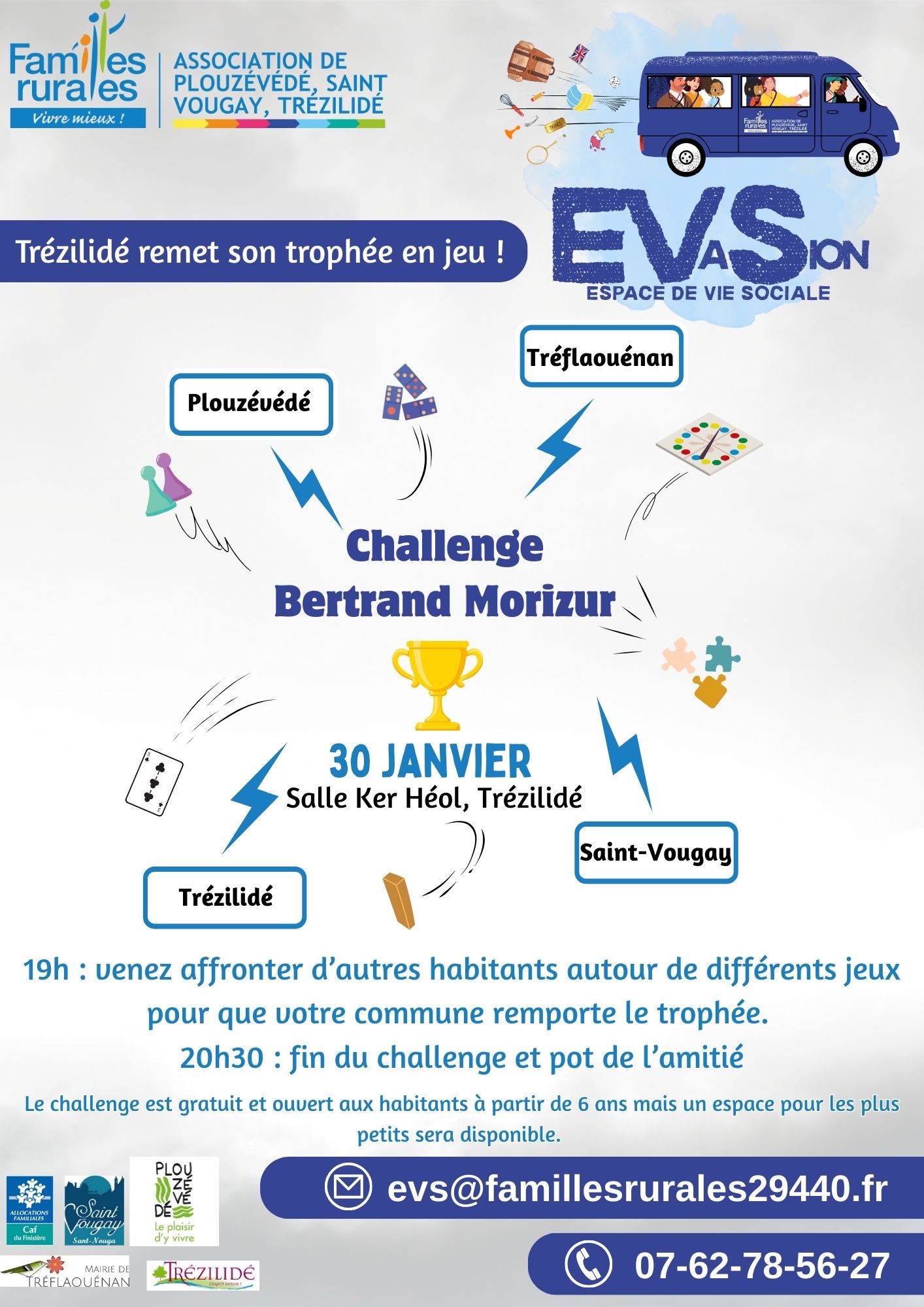 Retour liste Accueil >Animations >Challenge Bertrand Morizur Challenge Bertrand Morizur Trézilidé Venez affronter d’autres habitants autour de différents jeux et marquez des points pour que votre commune remporte le trophée cette année. Pot de l’amitié offert par la Mairie et association. Ouvert à tous. Dates et heures de l’événement – Le vendredi 30 janvier 2026 de 19:00 à 20:30 Localisation Salle Ker Héol Trézilidé Tel. 07 62 78 56 27 evs@famillesrurales29440.fr Ajouter au carnetRetirer du carnet Itinéraire – Accès À proximité