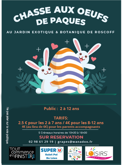 Créneaux au choix : 10h30 -11h30 -14h -15h et 16h. Il y aura des œufs pour tous les enfants inscrits !