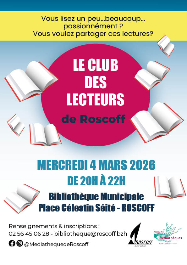 Retour liste Accueil >Animations >Club des lecteurs Club des lecteurs Roscoff Vous lisez un peu…beaucoup…passionnément ?Vous voulez partager ces lectures? Rendez vous pour un moment convivial à la bibliothèque de Roscoff. Renseignements & inscriptions auprès de la bibliothèque. Dates et heures de l’événement – Le mercredi 4 mars 2026 de 20:00 à 22:00 Localisation Bibliothèque 17 Rue Célestin Seite Roscoff Tel. 02 56 45 06 28 bibliotheque@roscoff.bzh Ajouter au carnetRetirer du carnet Itinéraire – Accès À proximité
