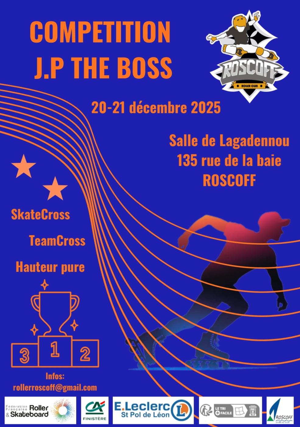 Retour liste Accueil >Animations >Compétition « JP The Boss »** Compétition « JP The Boss »** Roscoff Le Roller Club Roscoff organise une compétition nationale de niveau 2 étoiles. Au programme des épreuves de Skatecross, Teamcross et Hauteur pure. Une petite restauration sera proposée sur place. Dates et heures de l’événement – Du samedi 20 décembre 2025 au dimanche 21 décembre 2025 de 08:30 à 18:30 Localisation Complexe Sportif Lagadennou Roscoff Tel. 07 45 00 22 68 Ajouter au carnetRetirer du carnet Itinéraire – Accès À proximité