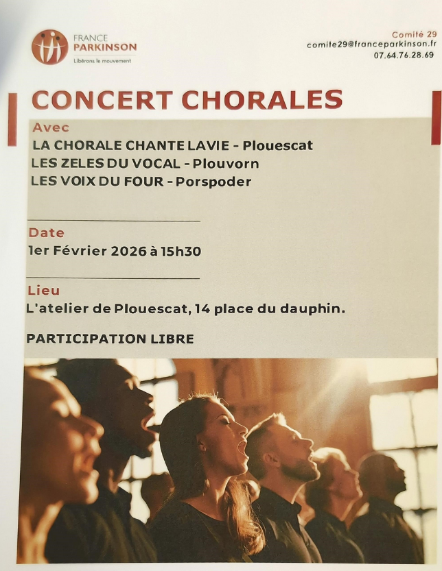 Les chorales « Chante la vie » de Plouescat, « les Zélés du vocal » de Plouvorn et « les Voix du Four » de Porspoder ont la joie de se réunir pour chanter au profit du comité local de France Parkinson. Nous vous attendons nombreux pour aider les malades et leurs proches.