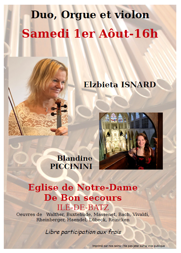 Le concert présente l’orgue en duo avec le violon. Le répertoire qui sera interprété par Blandine Piccinini organiste, titulaire de l’orgue de la Croix- Daurade à Toulouse et Elzbethia Isnard, professeur de violon à Toulouse. Toutes deux présenteront les instruments à travers les oeuvres qui font dialoguer le discours musical. Les sonorités chaudes et douces de chacun établissent divers décors.