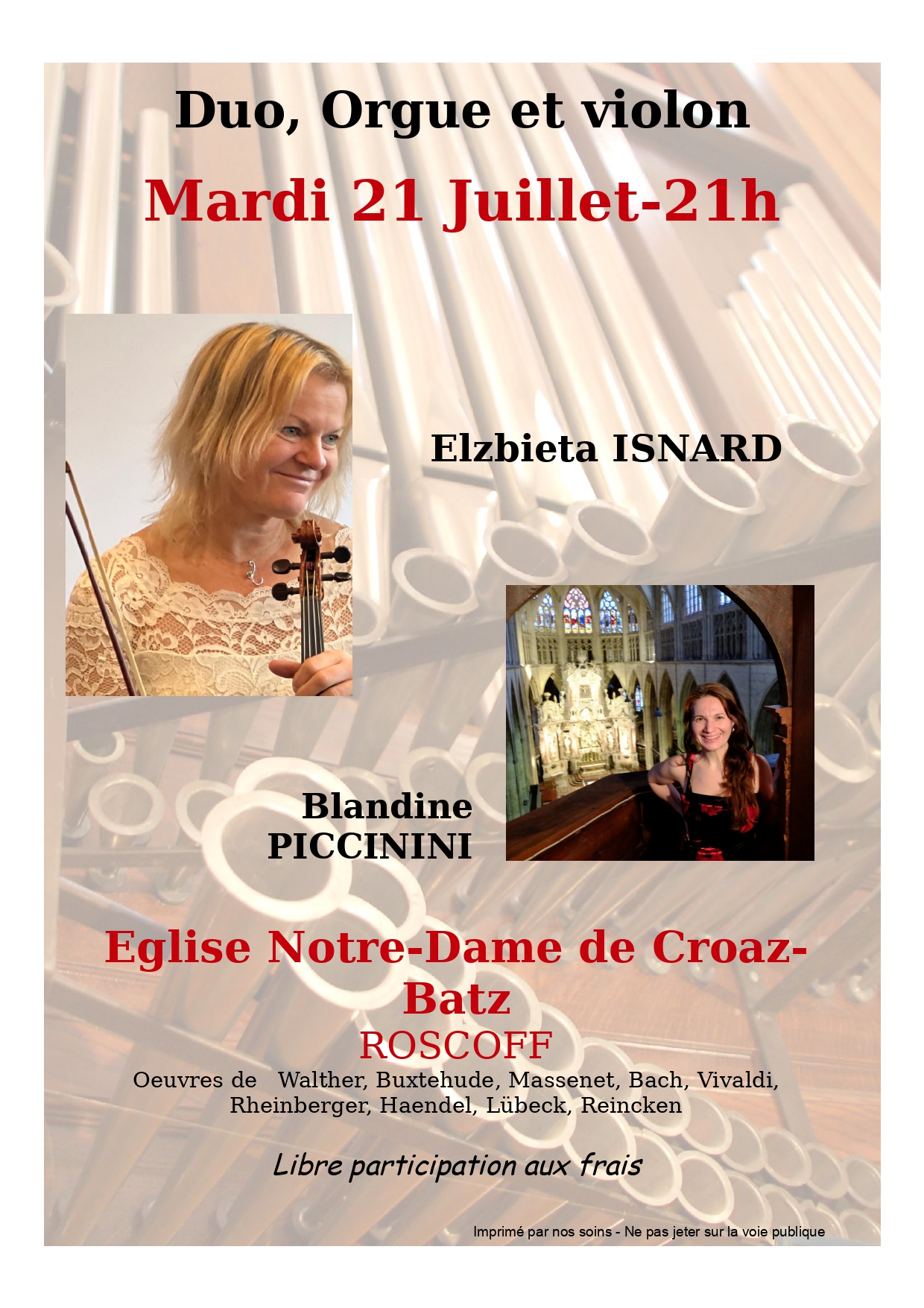Venez découvrir le répertoire interprété par Blandine Piccinini, organiste titulaire de l’orgue de la Croix-Daurade à Toulouse, et Elzbethia Isnard, professeure de violon à Toulouse. Elles vous feront découvrir leurs instruments à travers des œuvres qui font dialoguer le discours musical. Les sonorités chaudes et douces de chacun créent pour vous différents décors. Vous entendrez des œuvres de Vivaldi, Reincken, Bach, Massenet, Haendel et Rheinberger.