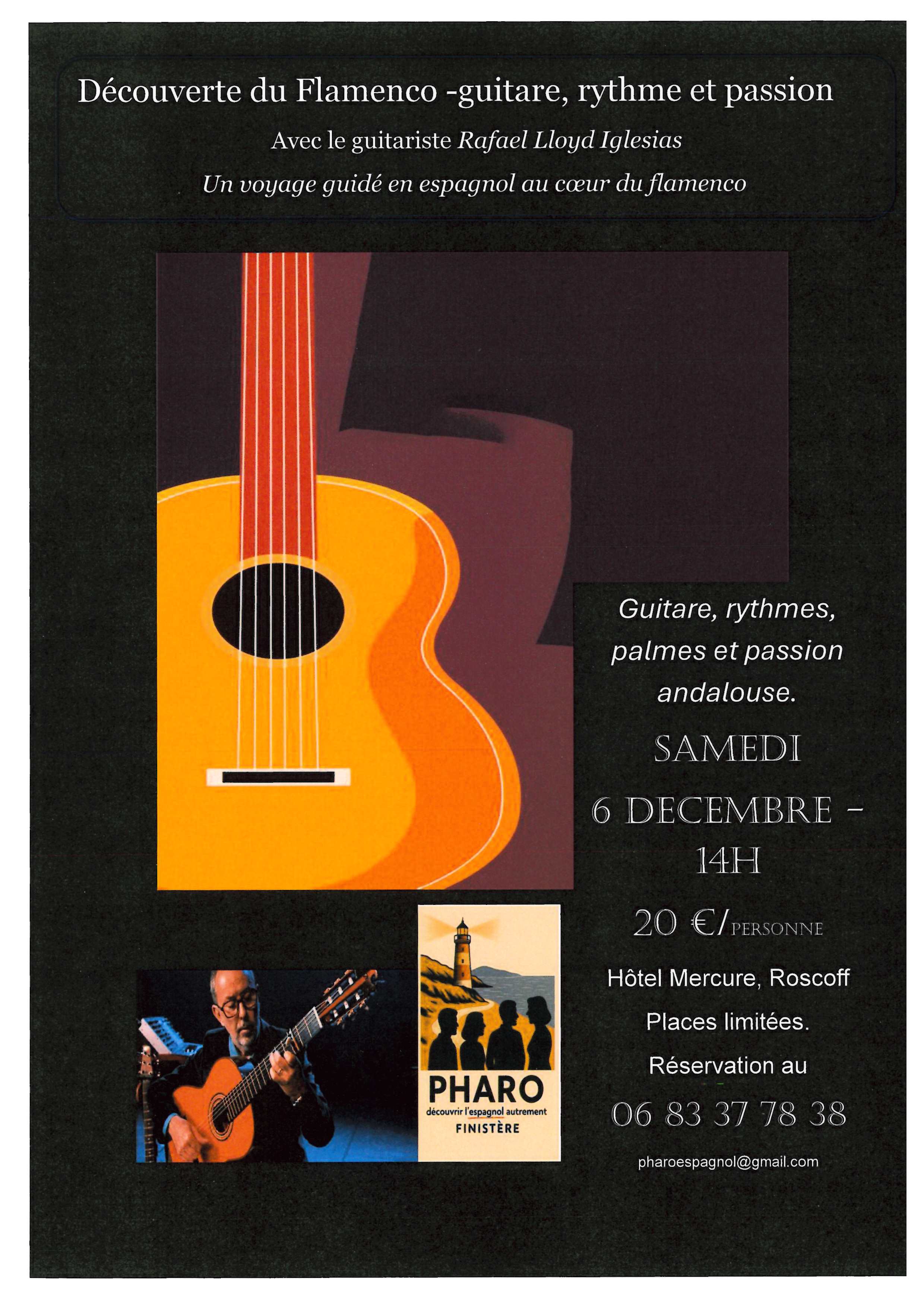 Retour liste Accueil >Animations >Découverte du Flamenco Découverte du Flamenco Roscoff 20€ Guitare, rythmes, palmes et passion andalouse avec le guitariste Rafael Lloyd Iglesias. Un voyage guidé en espagnol au cœur du flamenco.Places limitées, Réservation obligatoire. Dates et heures de l’événement – Le samedi 6 décembre 2025 à 14:00 Tarifs Tarif de base : à partir de 20,00€ Localisation 27 Place Lacaze Duthiers Roscoff Tel. 06 83 37 78 38 pharoespagnol@gmail.com Ajouter au carnetRetirer du carnet Itinéraire – Accès À proximité