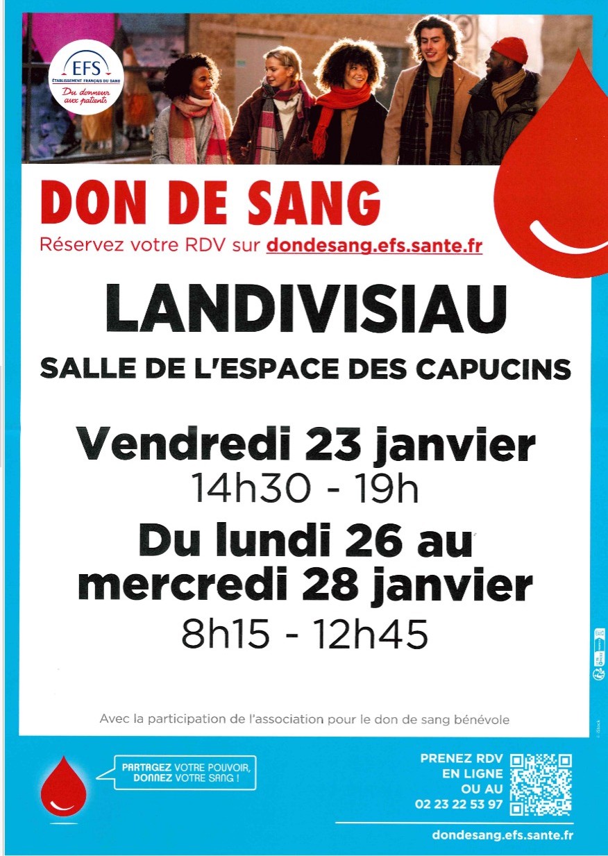 Retour liste Accueil >Animations >Don de sang Don de sang Landivisiau – Vendredi 23 : 14h30 à 19h.– Lundi 26, mardi 27 et mercredi 28 : 8h15 à 12h45. Rendez-vous en ligne ou au 02 23 22 53 97. Dates et heures de l’événement – Du vendredi 23 janvier 2026 au mercredi 28 janvier 2026 Localisation Salle Espace des Capucins Landivisiau Site internet Ajouter au carnetRetirer du carnet Itinéraire – Accès À proximité
