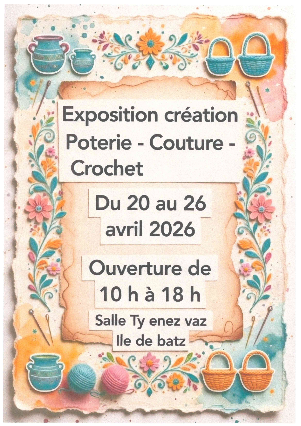 Retour liste Accueil >Animations >Exposition création : Poterie – Couture – Crochet Exposition création : Poterie – Couture – Crochet Île-de-Batz Exposition création : Poterie – Couture – Crochet à la salle Ty Enez Vaz. Dates et heures de l’événement – Du lundi 20 avril 2026 au dimanche 26 avril 2026 de 10:00 à 18:00 Localisation Salle ty Enez Vaz Île-de-Batz Ajouter au carnetRetirer du carnet Itinéraire – Accès À proximité