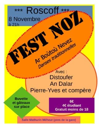 Retour liste Accueil >Animations >Fest Noz avec Ar Boutou Nevez Fest Noz avec Ar Boutou Nevez Roscoff À partir de6€ Fest noz à l’espace Mathurin Méheut, organisé par l’association Ar Boùtoù Nevez.Avec :– Distoufer– An Dalar– Pierre-Yves et compère Buvette et gâteaux sur place Dates et heures de l’événement – Le samedi 8 novembre 2025 à 21:00 Tarifs Tarif de base : à partir de 6,00€ (Gratuit -18 ans) Tarif réduit : à partir de 4,00€ (Étudiants) Localisation Espace Mathurin Méheut 2 Rue du Restel Roscoff Ajouter au carnetRetirer du carnet Itinéraire – Accès À proximité