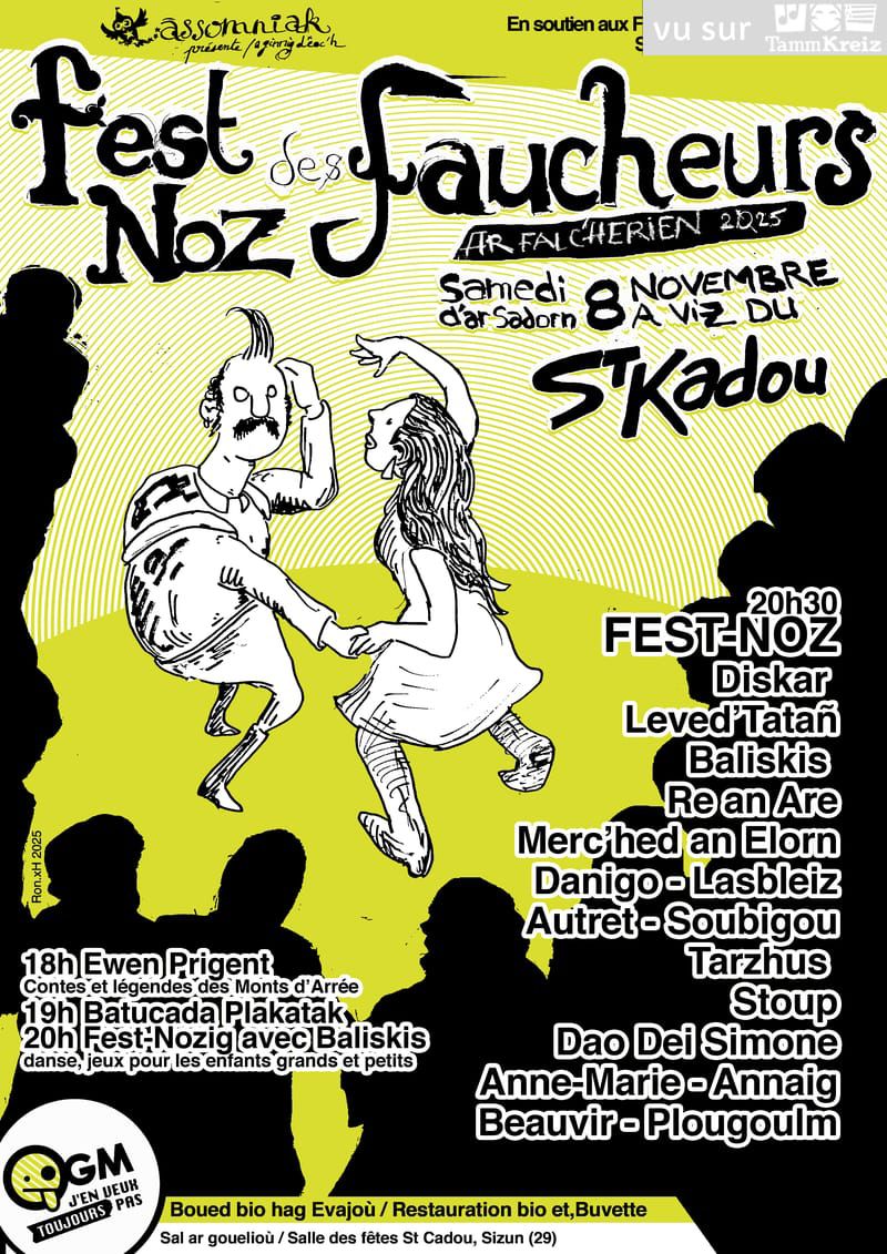 Retour liste Accueil >Animations >Fest-Noz des faucheurs Fest-Noz des faucheurs Sizun 18h : contes et légendes des monts d’arrées par Erwan Prigent19h : batucada plakatak20h : fest-Nogiz avec Baliskis, danses, jeux pour les enfants grands et petits.Restauration bio et buvette. Dates et heures de l’événement – Le samedi 8 novembre 2025 Localisation Salle des fêtes de Saint-Cadou Sizun Ajouter au carnetRetirer du carnet Itinéraire – Accès À proximité