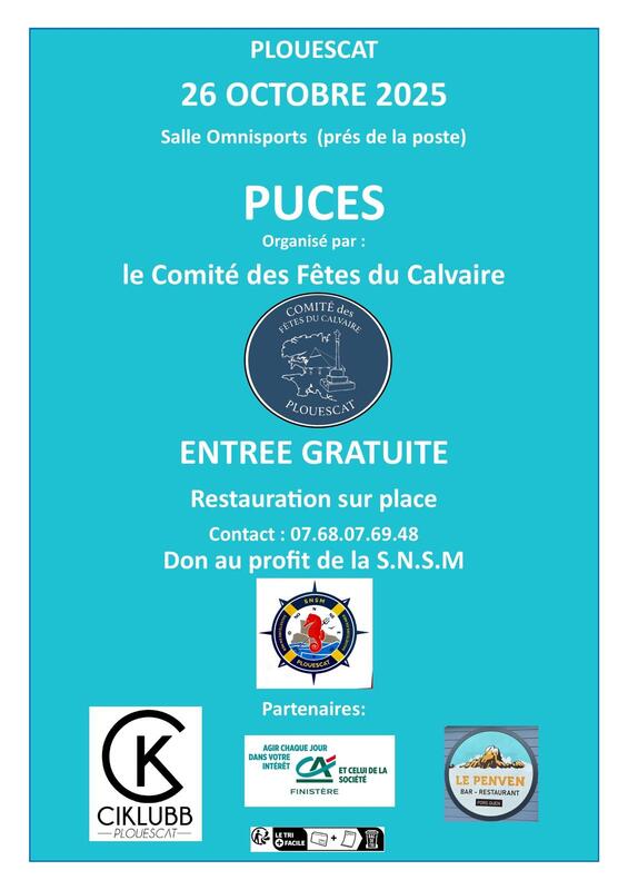 Retour liste Accueil >Animations >Foire aux puces au profit de la SNSM Foire aux puces au profit de la SNSM Plouescat Manifestation organisée par le comité du Calvaire de Plouescat, au profit de la SNSM locale. En plus des stands, une restauration avec grillades, frites maison, crêpes, gâteaux et buvette est programmée. Dates et heures de l’événement – Le dimanche 26 octobre 2025 de 09:00 à 17:00 Localisation Salle omnisport du centre Rue de Verdun Plouescat Tel. 07 68 07 69 48 Ajouter au carnetRetirer du carnet Itinéraire – Accès À proximité