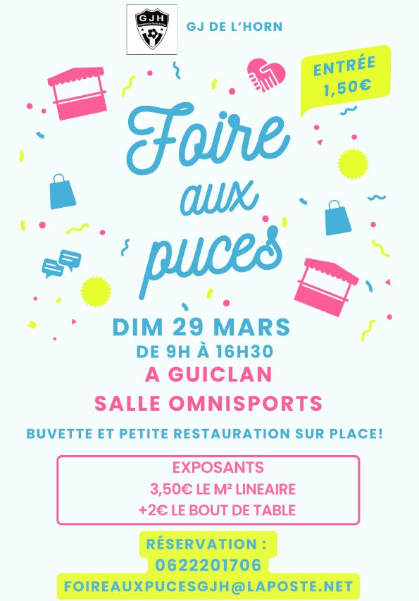 Retour liste Accueil >Animations >Foire aux puces Foire aux puces Guiclan 1.5€ Organisé par GJ de l’Horn. Buvette et petite restauration sur place. Exposants : 3.50€ le mètre linaire +2€ le bout de table. Dates et heures de l’événement – Le dimanche 29 mars 2026 de 09:00 à 16:30 Tarifs Tarif de base : à partir de 1,50€ Localisation Salle omnisports Guiclan Tel. 06 22 20 17 06 foireauxpucesgjh@laposte.net Ajouter au carnetRetirer du carnet Itinéraire – Accès À proximité