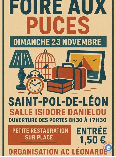 Retour liste Accueil >Animations >Foire aux puces Foire aux puces Saint-Pol-de-Léon 1.5€ Organisé par l’ AC Léonarde.Petite restauration sur place.6€ la table de 1,80. Dates et heures de l’événement – Le dimanche 23 novembre 2025 de 08:30 à 17:30 Tarifs Tarif de base : 1,50 € (Gratuit moins de 12 ans) Localisation Salle Isidore Daniélou Avenue des Carmes Saint-Pol-de-Léon Tel. 06 31 88 96 46 Ajouter au carnetRetirer du carnet Itinéraire – Accès À proximité