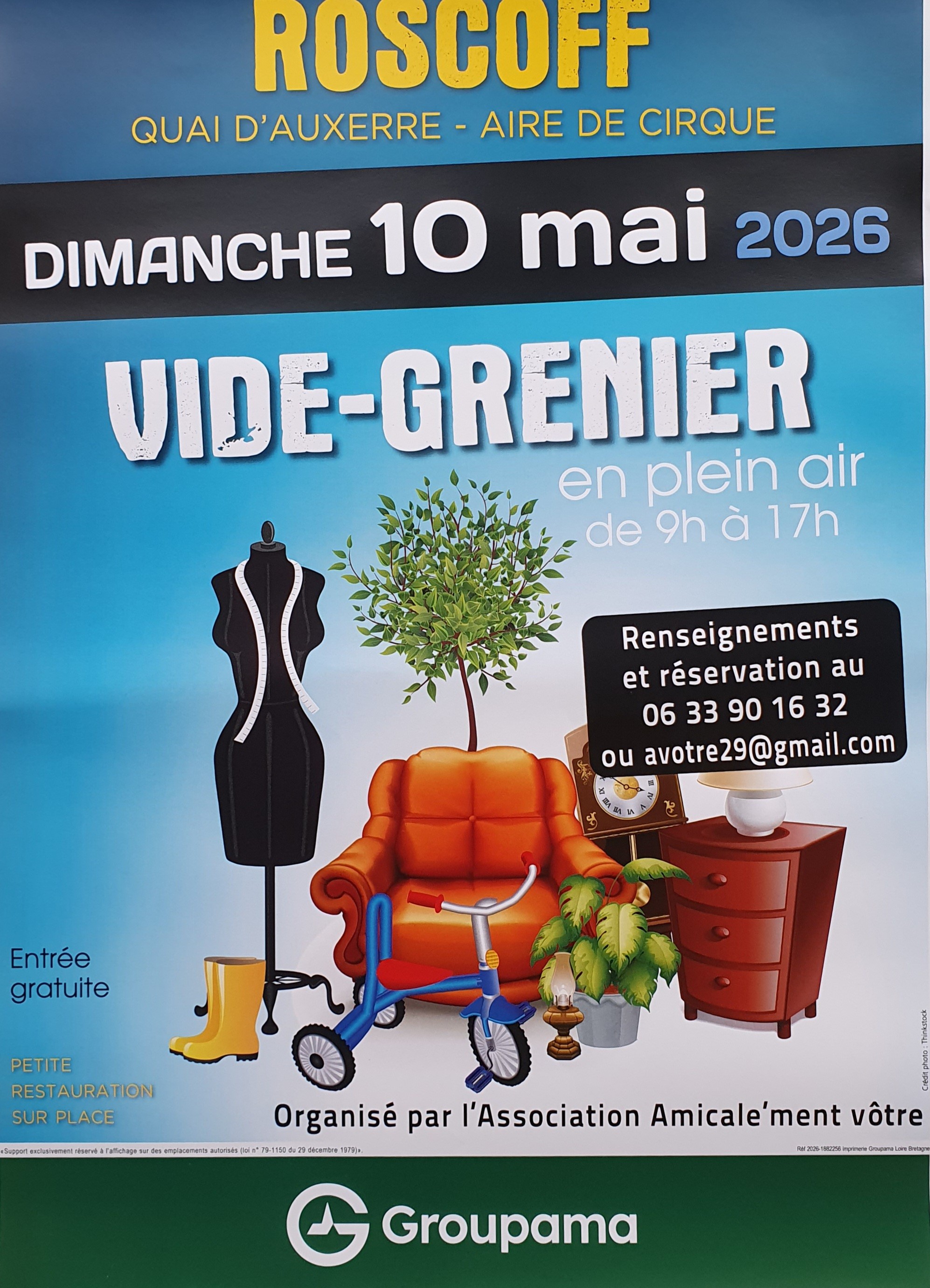 Retour liste Accueil >Animations >Foire aux puces – Vide-grenier Foire aux puces – Vide-grenier Roscoff Vide- grenier en plein air, Quai d’Auxerre, organisé par l’association Amicale’ment Vôtre.Buvette et petite restauration sur place. Exposants : 5 € le mètre linéaire (chaises et tables ne sont pas fournies). Dates et heures de l’événement – Le dimanche 10 mai 2026 de 09:00 à 17:00 Localisation Aire de Cirque Quai d’Auxerre Roscoff Tel. 06 33 90 16 32 avotre29@gmail.com Ajouter au carnetRetirer du carnet Itinéraire – Accès À proximité