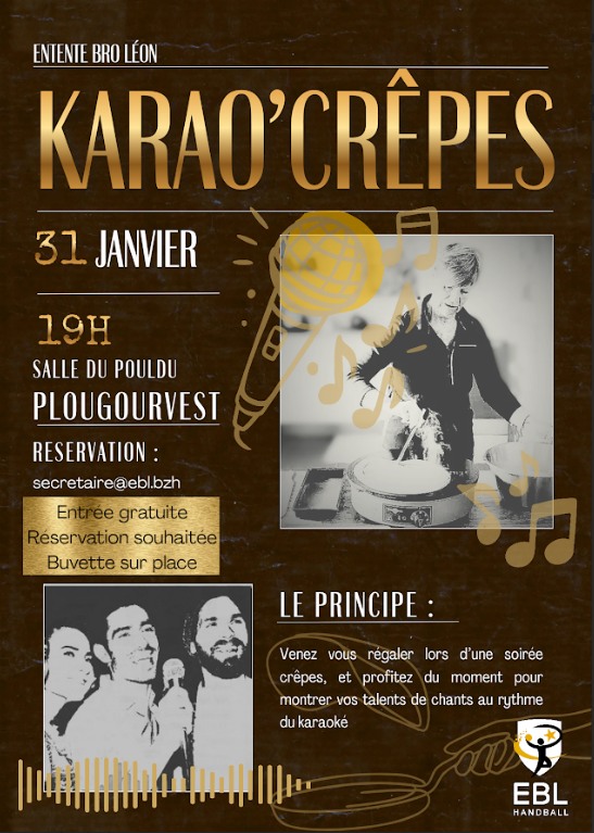 Retour liste Accueil >Animations >Karao’crêpes Karao’crêpes Plougourvest Venez vous régaler lors d’une soirée crêpes et profitez pour montrer vos talents de chants au rythme du karaoké. Réservation souhaitée. Buvette sur place. Dates et heures de l’événement – Le samedi 31 janvier 2026 à 19:00 Localisation Salle du Pouldu Plougourvest secretaire@ebl.bzh Ajouter au carnetRetirer du carnet Itinéraire – Accès À proximité