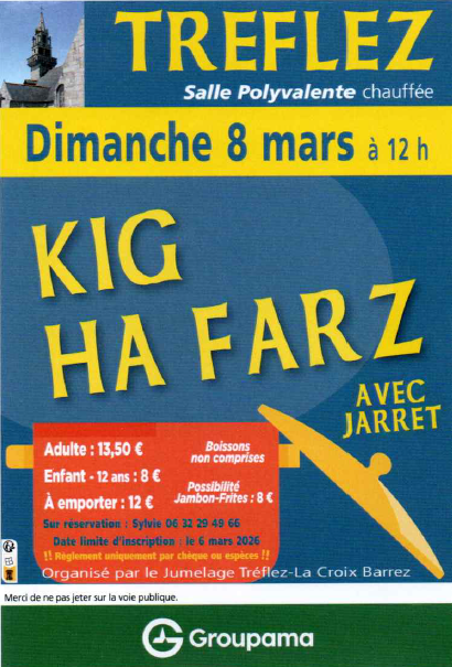 Le traditionnel Kig Ha Farz du comité de jumelage Tréflez – La Croix Barrez. Dans une salle chauffée, venez régaler vos papilles autour de ce plat typique, avec jambon-Frites possible pour ceux qui le préfèrent !