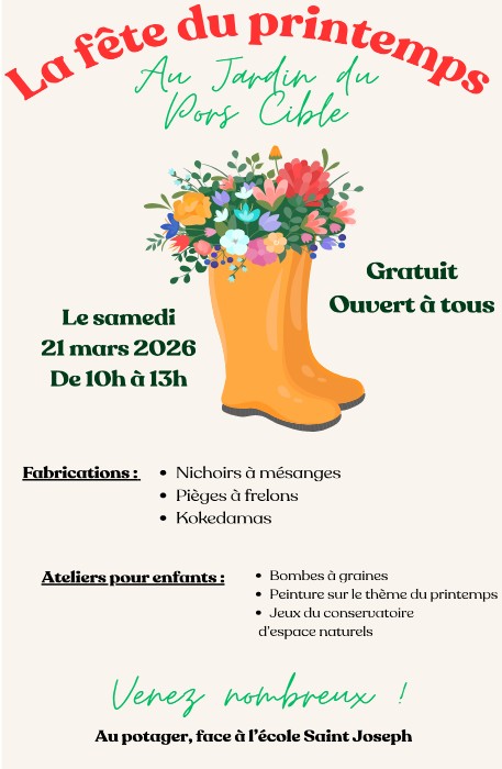 Retour liste Accueil >Animations >La Fête du Printemps La Fête du Printemps Lampaul-Guimiliau Fabrication : nichoirs à mésanges, pièges à frelons et kokedamas. Ateliers enfants : bombes à graines, peinture sur le thème du printemps, jeux du conservatoire d’espaces naturels. Dates et heures de l’événement – Le samedi 21 mars 2026 de 10:00 à 13:00 Localisation Jardin du Pors Cible Lampaul-Guimiliau lejardinduporscible@gmail.com Ajouter au carnetRetirer du carnet Itinéraire – Accès À proximité