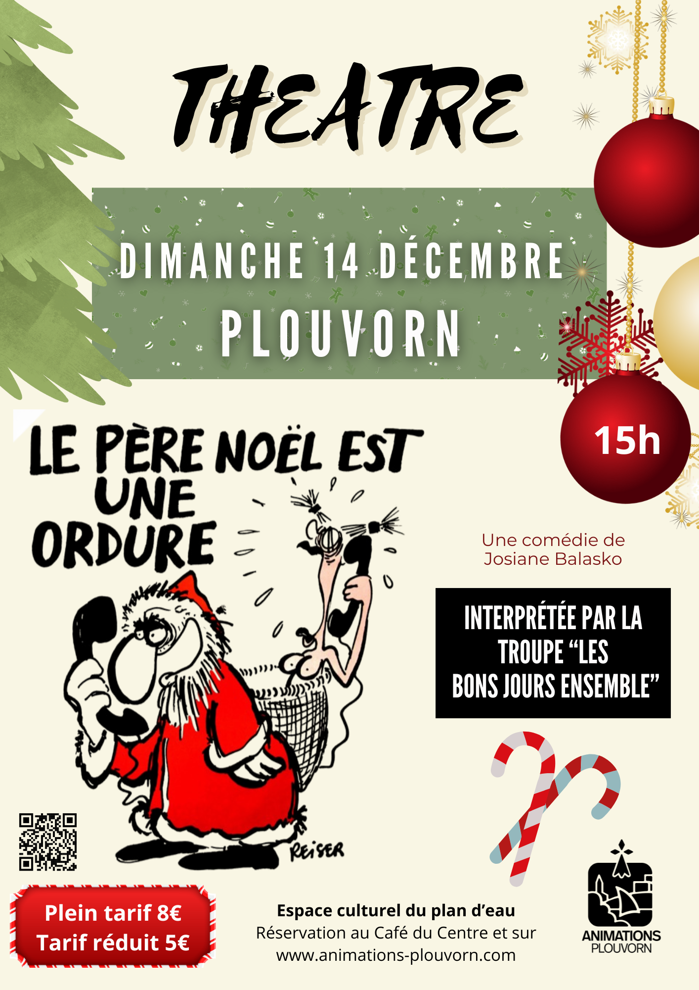 Retour liste Accueil >Animations >Le Père Noël est une Ordure Le Père Noël est une Ordure Plouvorn À partir de8€ Animation Plouvorn et Les Bon Jours Ensemble présentent la célèbre Pièce du Splendid. Nombre de place limité, réservation conseillée. Dates et heures de l’événement – Le dimanche 14 décembre 2025 de 15:00 à 17:00 Tarifs Tarif de base : à partir de 8,00€ Tarif réduit : à partir de 5,00€ Localisation Espace Culturel du Plan d’eau Plouvorn animations.plouvorn@gmail.com Site internet Ajouter au carnetRetirer du carnet Itinéraire – Accès À proximité