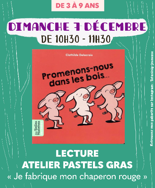 Une animation de Tataninig. Lecture et atelier pastel gras, je fabrique mon chaperon rouge. De 3 à 9 ans. Accès libre sans inscription. Renseignements : 02.57.68.64.21 ou mediatheque.plouvorn@orange.fr