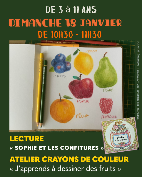 Retour liste Accueil >Animations >Lecture « Sophie et les confitures » + bricolage Lecture « Sophie et les confitures » + bricolage Plouvorn Une animation de Tataninig. Atelier crayons de couleurs « j’apprends à dessiner des fruits ».Public : de 3 à 11 ans Accès libre sans inscription.Renseignements : 02.57.68.64.21 ou mediatheque.plouvorn@orange.fr Dates et heures de l’événement – Le dimanche 18 janvier 2026 de 10:30 à 11:30 Localisation Médiathèque Plouvorn Ajouter au carnetRetirer du carnet Itinéraire – Accès À proximité