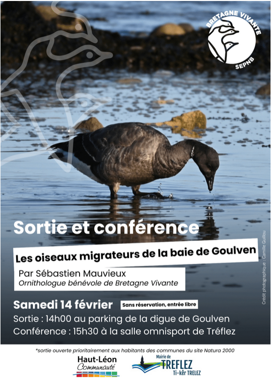 Conférence et temps d’échanges autour des enjeux de conservation, des effectifs observés et de leur évolution, en lien avec le recensement mensuel des oiseaux d’eau réalisé en partenariat avec Haut-Léon Communauté et animé par Sébastien Mauvieux, ornithologue bénévole de Bretagne Vivante, et Quentin Rochas, salarié de Bretagne Vivante.