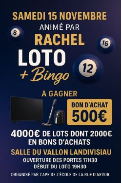Retour liste Accueil >Animations >Loto Bingo Loto Bingo Landivisiau Animé par Rachel. Nombreux lots : bons d’achats, télévision, balai aspirateur, air fryer … Ouverture des portes à 17h30. Tarif : 3 € le carton. 1 € le bingo. Petite restauration et buvette sur place. Dates et heures de l’événement – Le samedi 15 novembre 2025 à 19:30 Localisation Salle Le Vallon Landivisiau Ajouter au carnetRetirer du carnet Itinéraire – Accès À proximité