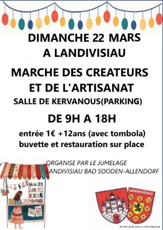 Retour liste Accueil >Animations >Marché créateurs et artisanat Marché créateurs et artisanat Landivisiau 1€ Buvette et restauration sur place. Organisé par le Comité de jumelage de Landivisiau « Bad Sooden Allendorf ». Dates et heures de l’événement – Le dimanche 22 mars 2026 de 09:00 à 18:00 Tarifs Tarif de base : à partir de 1,00€ (Pour les + de 12 ans (avec tombola)) Localisation Salle de Kervanous Landivisiau Ajouter au carnetRetirer du carnet Itinéraire – Accès À proximité