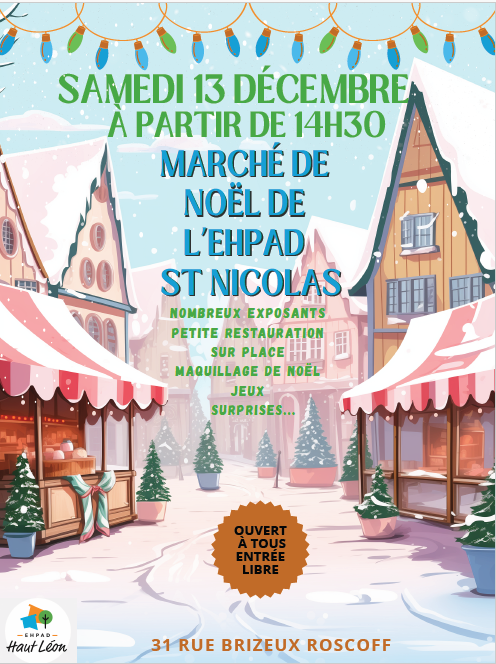 Retour liste Accueil >Animations >Marché de Noël de l’ehpad St Nicolas Marché de Noël de l’ehpad St Nicolas Roscoff Nombreux exposants, maquillage de Noël, jeux…Petite restauration.Ouvert à tous – Entrée libre Dates et heures de l’événement – Le samedi 13 décembre 2025 de 14:30 à 17:30 Localisation Ehpad saint Nicolas 31 Rue Brizeux Roscoff Tel. 02 98 24 43 00 Ajouter au carnetRetirer du carnet Itinéraire – Accès À proximité