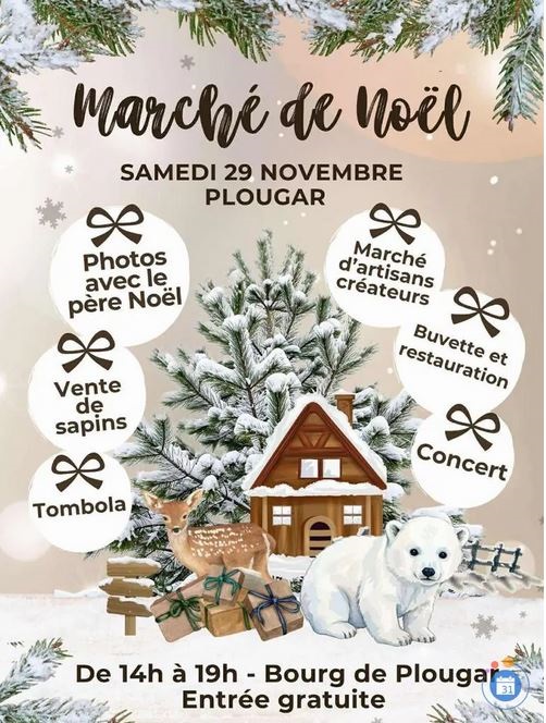 Retour liste Accueil >Animations >Marché de Noël Marché de Noël Plougar Marché d’artisans créateurs. Vente de sapins. Photo avec le Père Noël. Tombola. Concert. Buvette et restauration. Dates et heures de l’événement – Le samedi 29 novembre 2025 de 14:00 à 19:00 Localisation Le bourg Plougar Ajouter au carnetRetirer du carnet Itinéraire – Accès À proximité