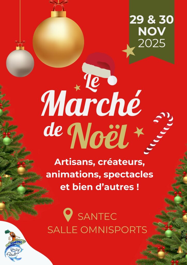 Retour liste Accueil >Animations >Marché de Noël Marché de Noël Santec Le comité des Fêtes de Santec organise un marché de Noël.Artisans, créateurs, animations, spectacles et bien d’autres ! Dates et heures de l’événement – Du samedi 29 novembre 2025 au dimanche 30 novembre 2025 Localisation Salle omnisports 71 Place Isidore Roudaut Santec Ajouter au carnetRetirer du carnet Itinéraire – Accès À proximité